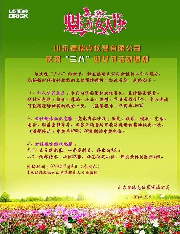 我國于1949年12月規(guī)定每年的3月8日婦女節(jié),迄今為止已有60多年的歷史,而今年恰逢是三八婦女節(jié)第65周年。為了活躍企業(yè)文化氛圍,表彰和感謝女同胞們?yōu)楣咀龀龅呢暙I(xiàn),山東德瑞克儀器有限公司決定于3月8日為所有女員工準(zhǔn)備了一系列別開生面的歡慶活動(dòng),在表彰和感恩的同時(shí)也為德瑞克女同胞們展示個(gè)人才藝,彰顯女性風(fēng)采提供了一個(gè)良好的舞臺(tái)。活動(dòng)具體內(nèi)容如下: