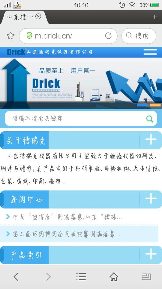 山東德瑞克作為引領(lǐng)創(chuàng)新技術(shù)的領(lǐng)導(dǎo)者,一直不斷的創(chuàng)造新技術(shù),挖掘新技能,學(xué)習(xí)新知識(shí);“不斷創(chuàng)新”貫穿著德瑞克公司的發(fā)展歷程。我們秉承“客戶滿意是我們永無止境的追求”的服務(wù)準(zhǔn)則,為方便客戶更快速,更便捷的了解我們的產(chǎn)品,2015年新年伊始,特推出手機(jī)網(wǎng)站“m.drick.cn”“m.jndrktest.com”“m.worlddrick.com”供大家瀏覽,為全球客戶提供檢測儀器行業(yè)最新資訊,最新發(fā)展方向。